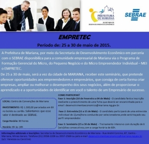A ADOP está apoiando a Secretaria de Desenvolvimento Econômico de Mariana e o SEBRAE/MG na divulgação do EMPRETEC, que será realizado entre os dias 25 a 30 de maio, no Centro de Convenções de Mariana.