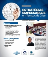 No dia 11 de junho, quinta-feira, a ACEOP promove em sua sede a palestra “Estratégias Empresariais em Tempos de Crise”, apresentada pelo professor Marcos Fábio Ferreira. A palestra acontece às 19h30 e conta com o apoio do SEBRAE.