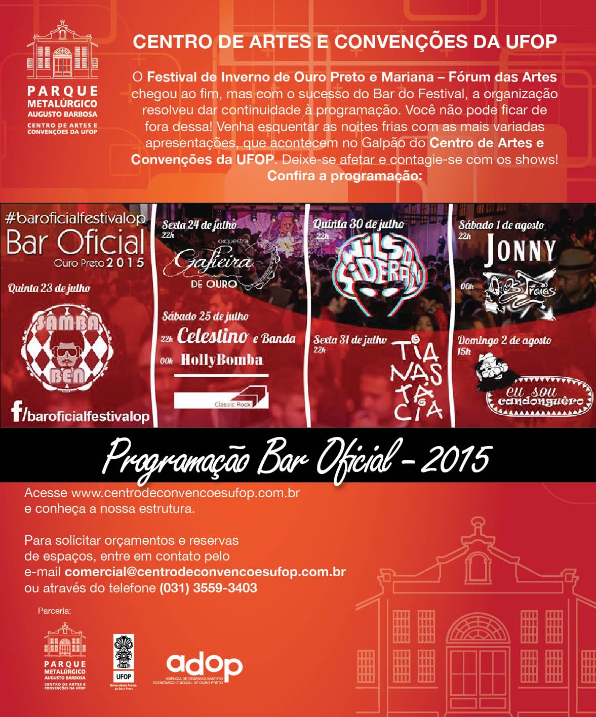 O Bar Oficial, conhecido por ser realizado durante os mês de julho junto com o Festival de Inverno de Ouro Preto e Mariana, estendeu sua programação para além do festival. Serão duas semanas a mais de programação para garantir a diversão de moradores e turistas na cidade. O projeto conta com a parceria da ADOP, do Centro de Artes e Convenções e da UFOP. Confira a programação: