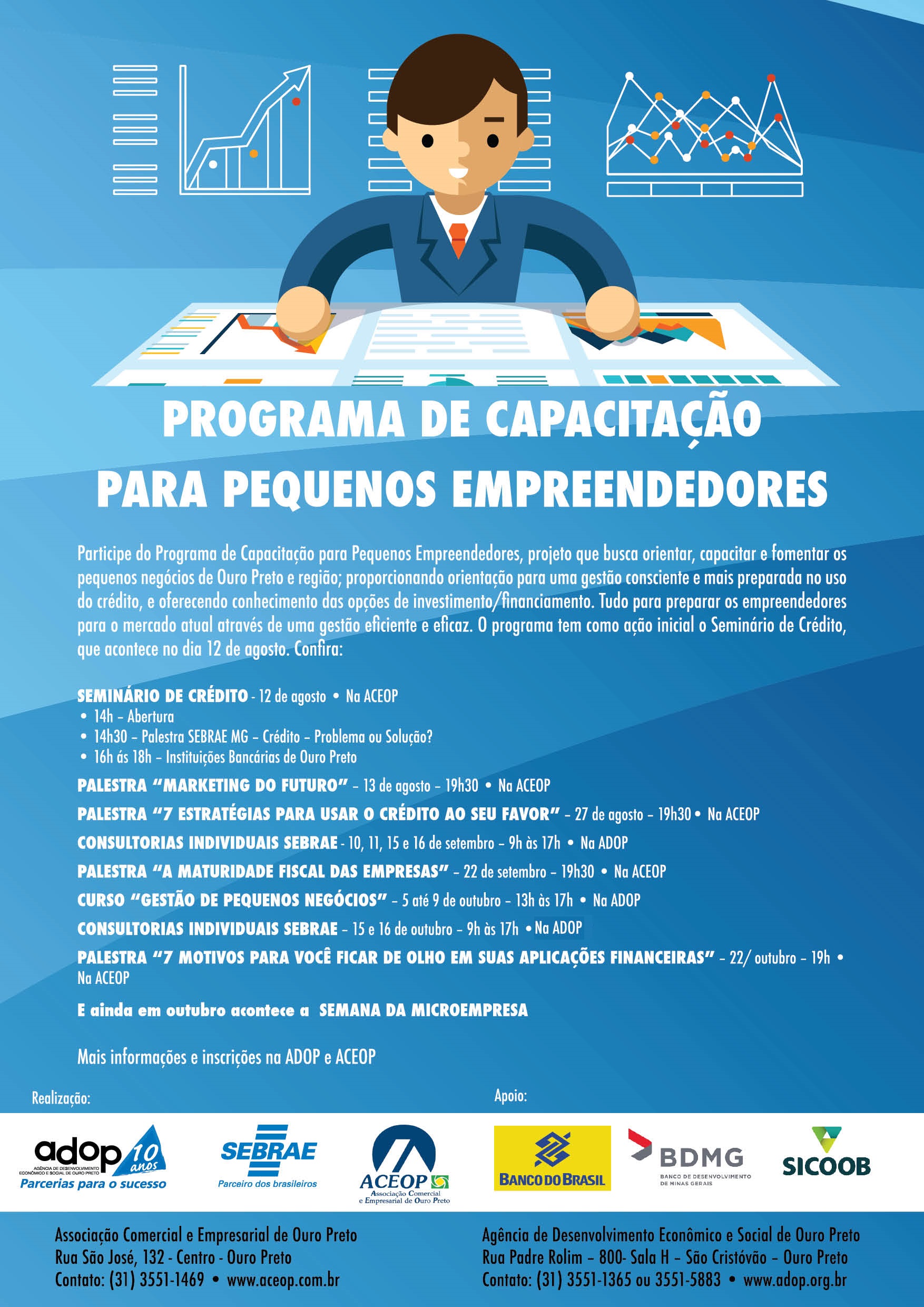 O programa conta com um Seminário de Crédito, realizado no dia 12 de agosto, e também com as palestras Marketing do Futuro, 7 estratégias para usar o crédito a seu favor, A maturidade fiscal das empresas, 7 motivos para você ficar de olho em suas aplicações financeiras; com o curso Gestão de Pequenos Negócios; consultorias individuais, e a Semana da Microempresa. As inscrições tanto para as atividades do programa quanto do seminário podem ser feitas na ADOP ou na ACEOP. Mais informações pelos telefones (31) 3551-1365 e (31) 3551-1469. Confira a programação completa do Programa de Capacitação para Pequenos Empresários: