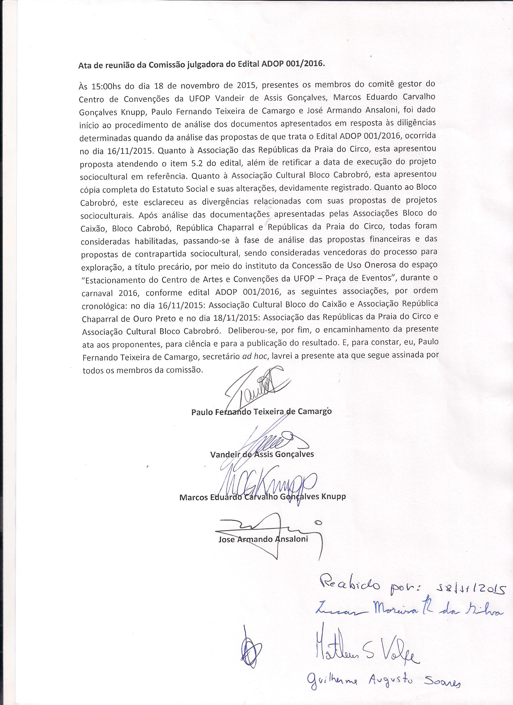 A AGÊNCIA DE DESENVOLVIMENTO ECONÔMICO E SOCIAL DE OURO PRETO - ADOP, através do Gestor do Centro de Artes e Convenções da UFOP, Sr. Vandeir Assis, no uso de suas atribuições legais, torna público, para conhecimento dos interessados, o resultado do Edital 001/2016 para uso do espaço do Estacionamento do Centro de Artes e Convenções da UFOP – Praça de Eventos, durante o Carnaval de 2016.