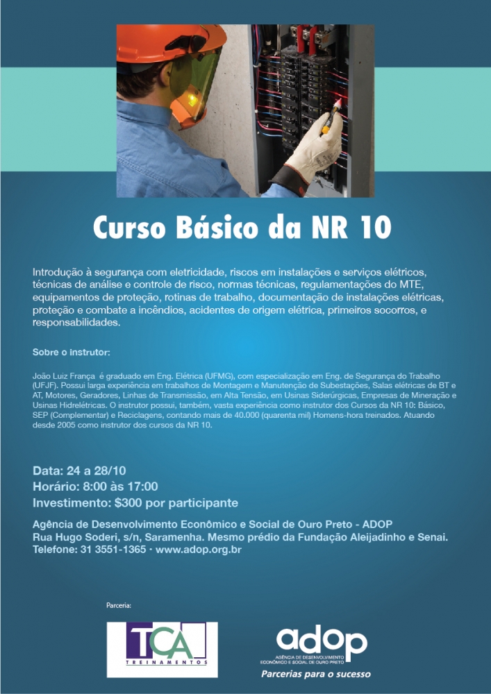 A Agência de Desenvolvimento Econômico e Social de Ouro Preto (ADOP) está com vagas abertas para cursos de capacitação voltados a profissionais que interagem com instalações e energia elétrica. São oferecidos três cursos, com ênfase na Norma Regulamentadora do Ministério do Trabalho e Emprego que visa garantir a segurança e a saúde desses profissionais.