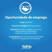 Para mais informações sobre a vaga, entre em contato com a ADOP pelo telefone: (31) 3551-1365. Os interessados podem entregar os curriculos impressos na sede da ADOP ( Rua Hugo Soderi, 21B - Saramenha) ou enviar para o e-mail produtoseservicos@adop.org.br, até sexta-feira (08/06)
