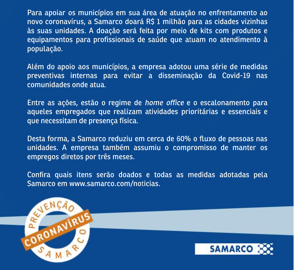 A mineradora Samarco tem realizado ações para auxiliar no combate ao Covid-19. No comunicado abaixo ela apresenta algumas ações que tem sido desenvolvidas nesse período. Confira: