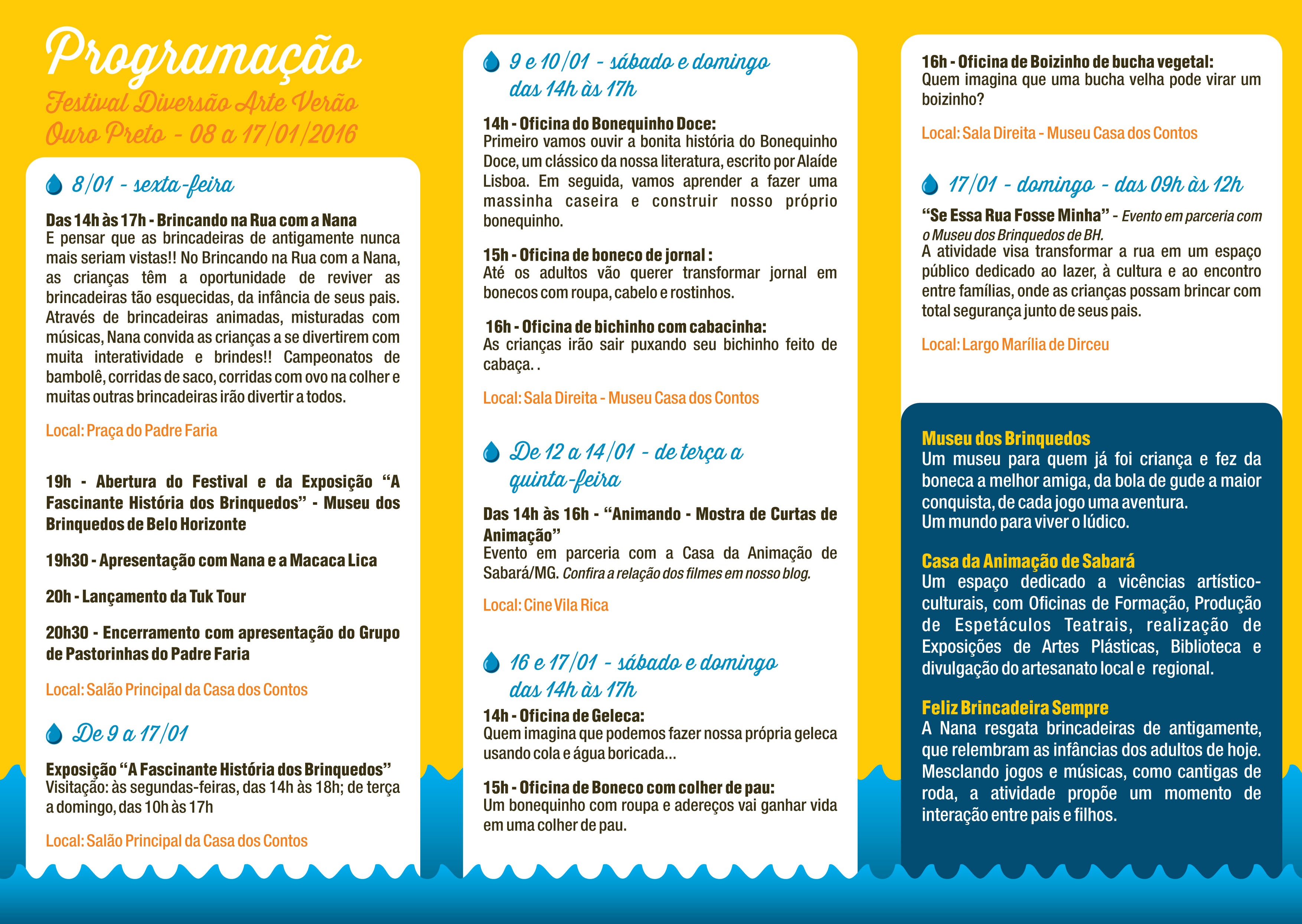 Arte e entretenimento são o foco do Festival Diversão Arte Verão que acontece de 16 a 24 de janeiro de 2015, em Ouro Preto. A iniciativa objetiva preencher uma lacuna no calendário de eventos da cidade no mês de janeiro, fomentar o turismo, gerar renda e movimentar o comércio local, além de proporcionar diversão e lazer para a população.